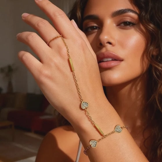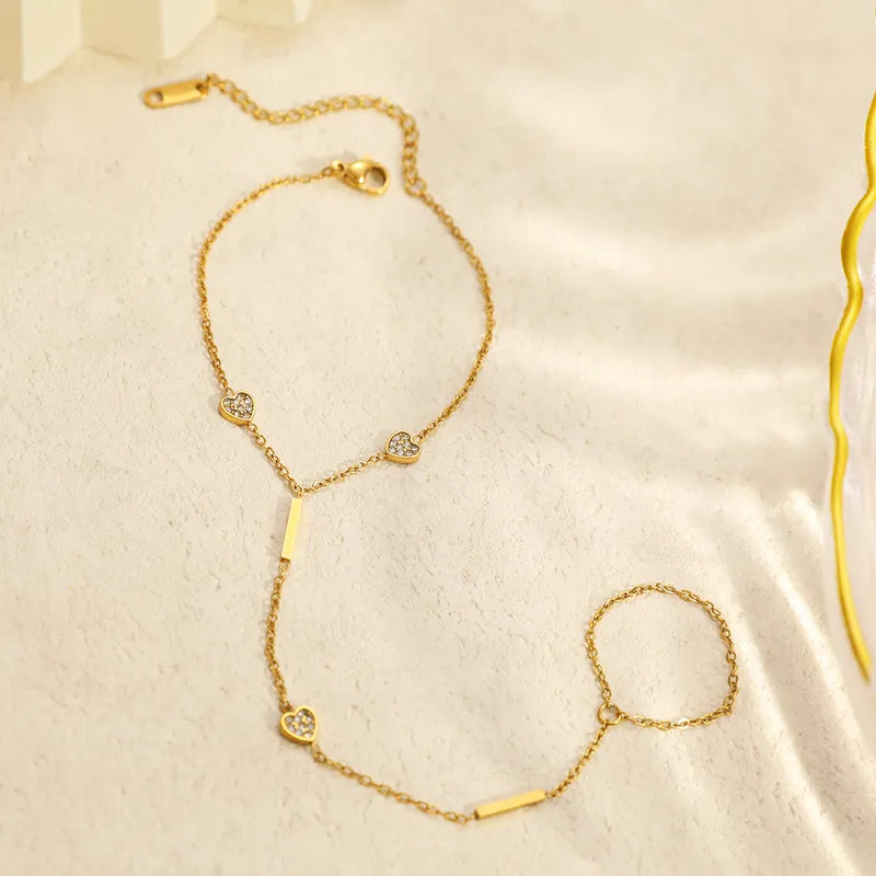 Heart-Shaped Full Diamond Geometric Line O-Chain, 18K Gold Plated, Stainless Steel Vacuum Electroplated Back Of Hand Bracelet Chain